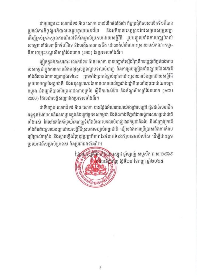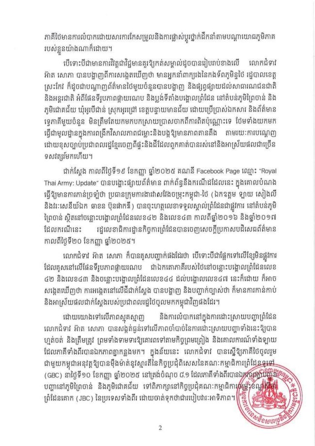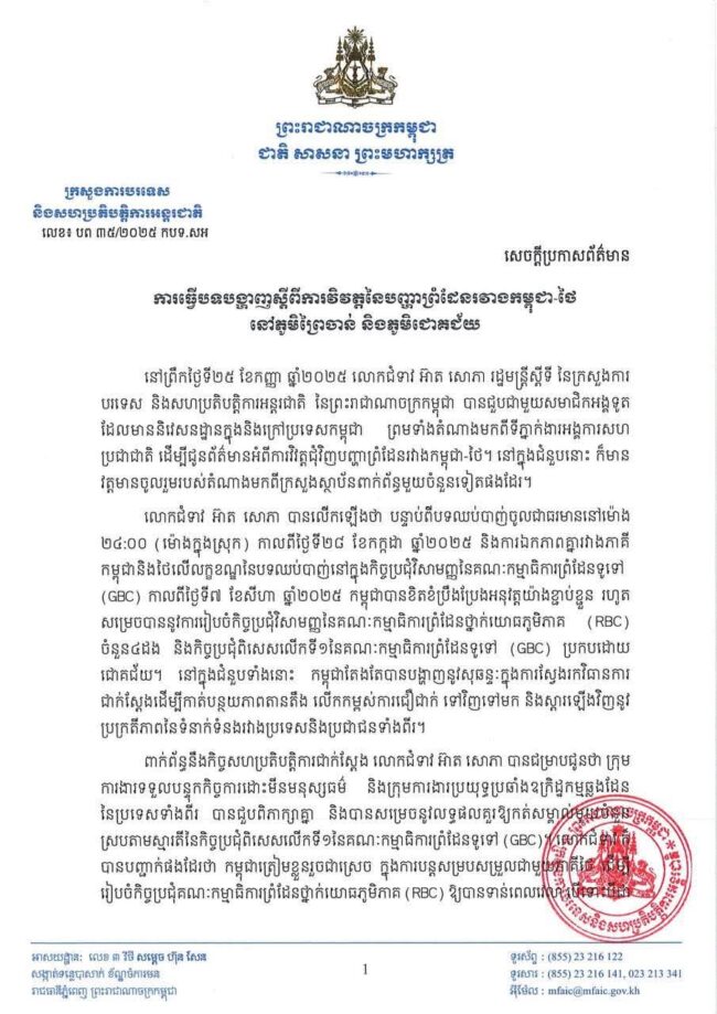 Homeព័ត៌មានជាតិសេចក្តីប្រកាសព័ត៌មាន ការធ្វើបទបង្ហាញស្តីពីការវិវត្តនៃបញ្ហាព្រំដែនរវាងកម្ពុជា-ថៃ នៅភូមិព្រៃចាន់ និងភូមិជោគជ័យ user khmerpitSeptember 26, 2025 1:41 am CATEGORIES ព័ត៌មានជាតិសន្តិសុខ និង សង្គម Share This