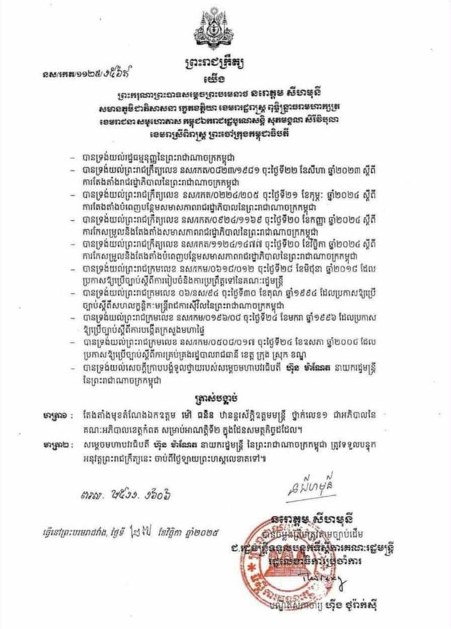 យោងតាមព្រះរាជក្រឹត្យ ចុះថ្ងៃទី២៧ ខែវិច្ឆិកា ២០២៥ ព្រះមហាក្សត្រនៃកម្ពុជា ព្រះករុណាព្រះបាទសម្ដេចព្រះបរមនាថ នរោត្តម សីហមុនី បានត្រាស់បង្គាប់តែងតាំង ឯកឧត្តម ម៉ៅ ធនិន ជាអភិបាលខេត្តកំពត សម្រាប់អាណត្តិទី២ ជាបន្តទៀត។