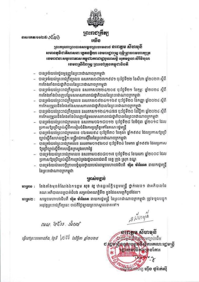 ព្រះមហាក្សត្រ ត្រាស់បង្គាប់តែងតាំងឯកឧត្តម សុខ លូជាអភិបាលខេត្តបាត់ដំបងអាណត្តិទី២