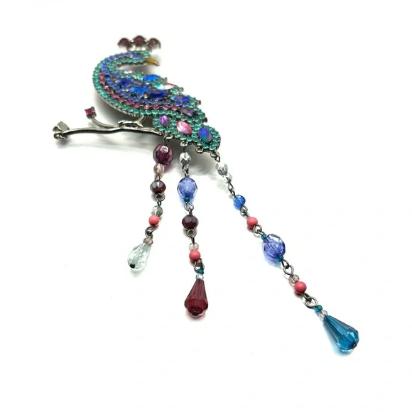 This amazing statement brooch from Avon, is circa 1980. It is from my personal collection. The combination of turquoise, pink, blue, and magenta reflects the light beautifully. It is approximately 7 inches from the top to bottom and 2.75 in width. The condition is very good.Thank you for your interest. Please contact me with any questions.